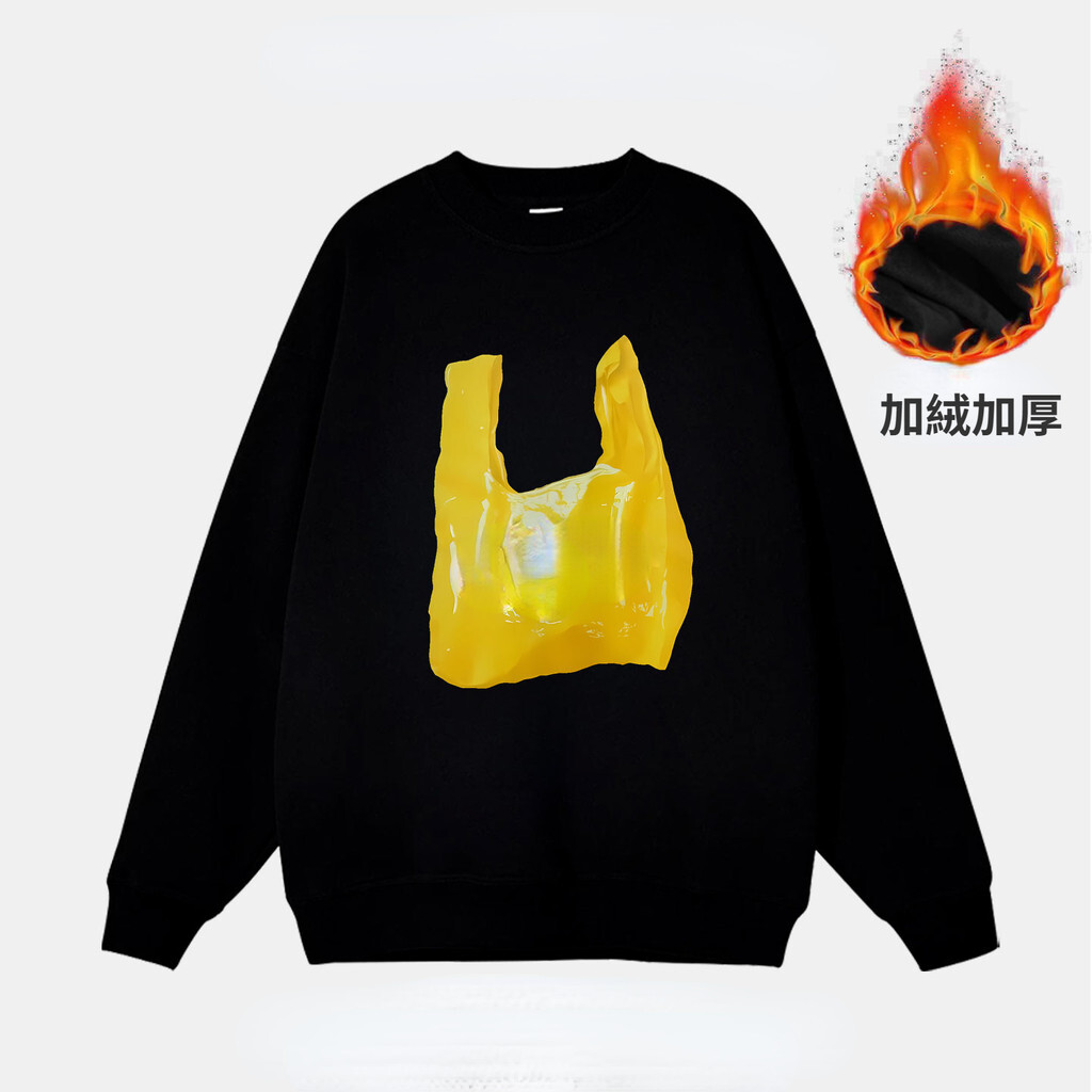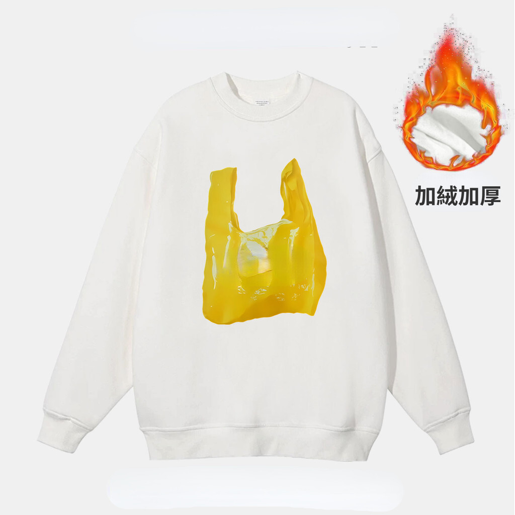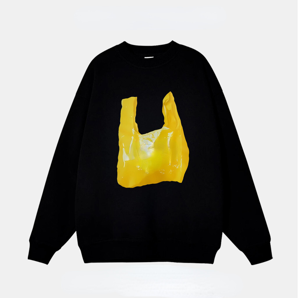 ‧ 話題性印花設計:將常見塑料袋轉化為特色印花,設計風格可能偏向幽默、潮牌或帶有環保議題暗示,極具辨識度。