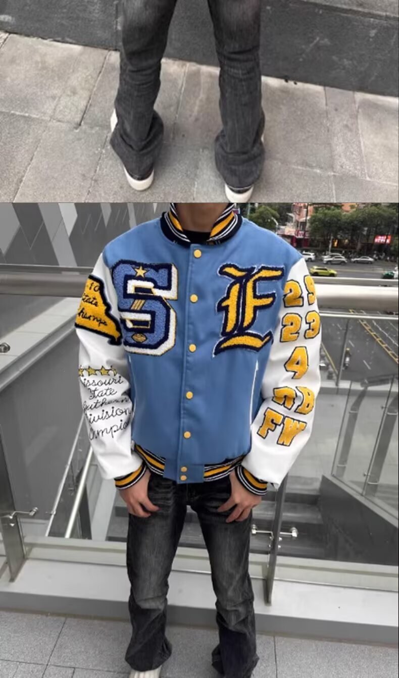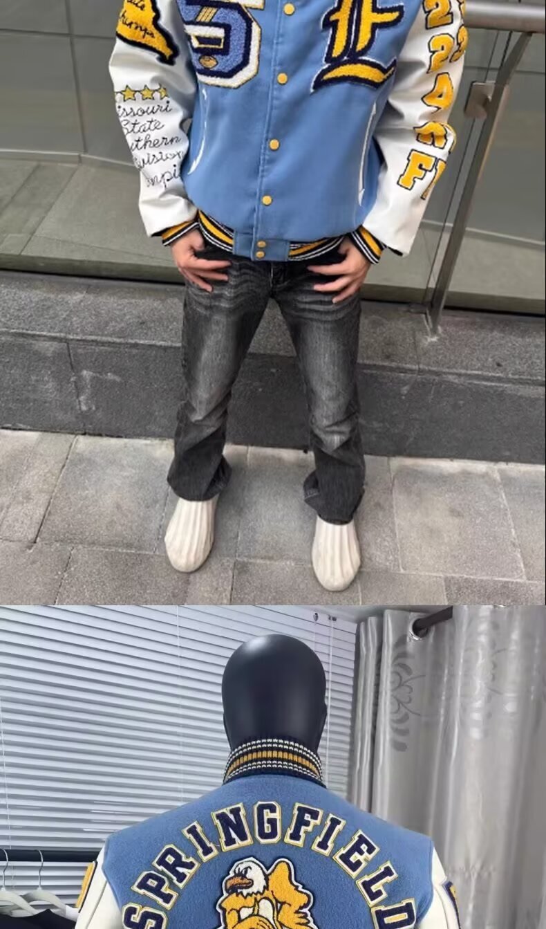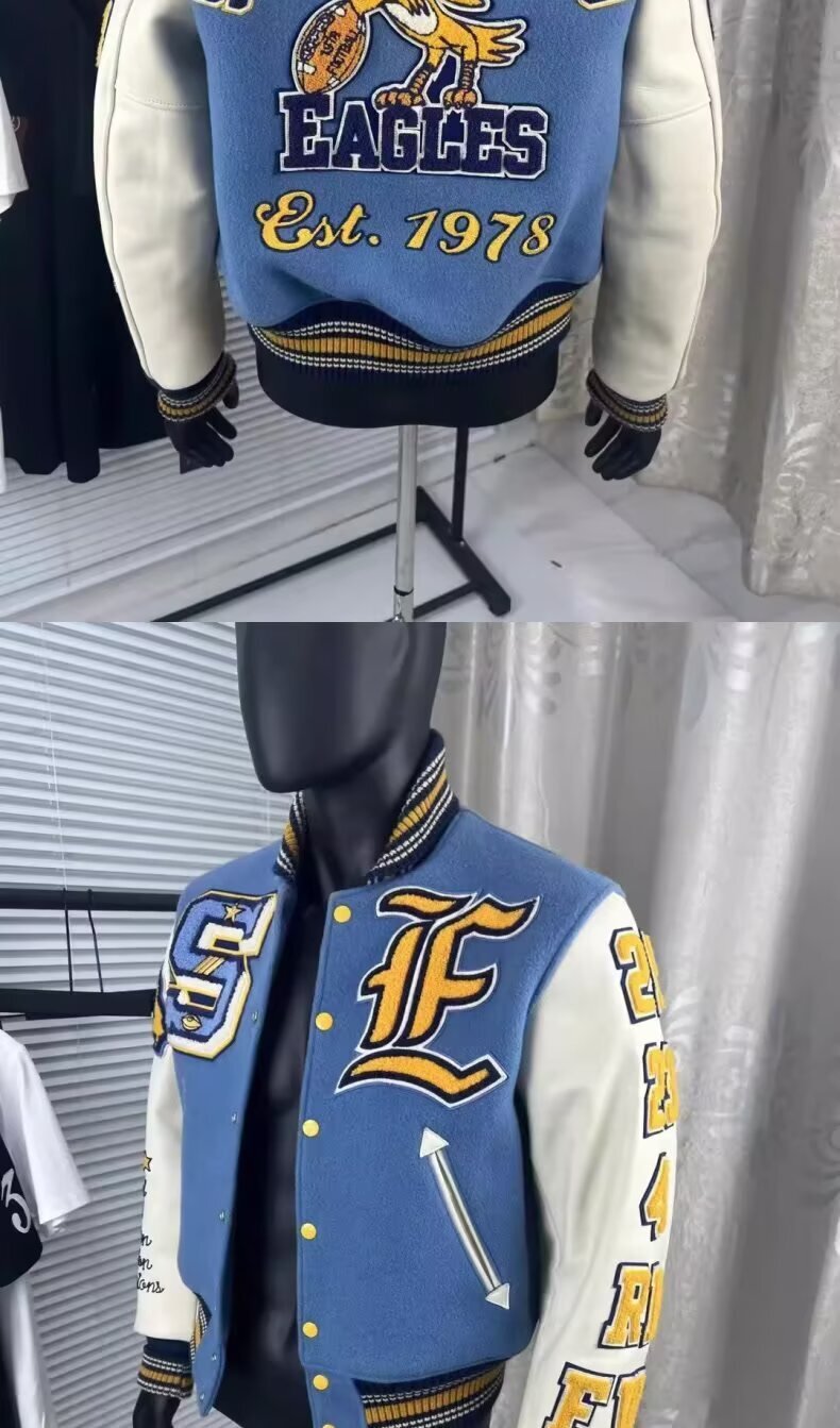美式淺藍撞色棒球外套,後背飾有 EAGLES 刺繡圖案,復古學院風格設計,男女同款寬鬆版型,穿著舒適不挑身型,日常休閒皆適穿,百搭各種大學 T、帽 t 與休閒褲,輕鬆打造休閒造型。
