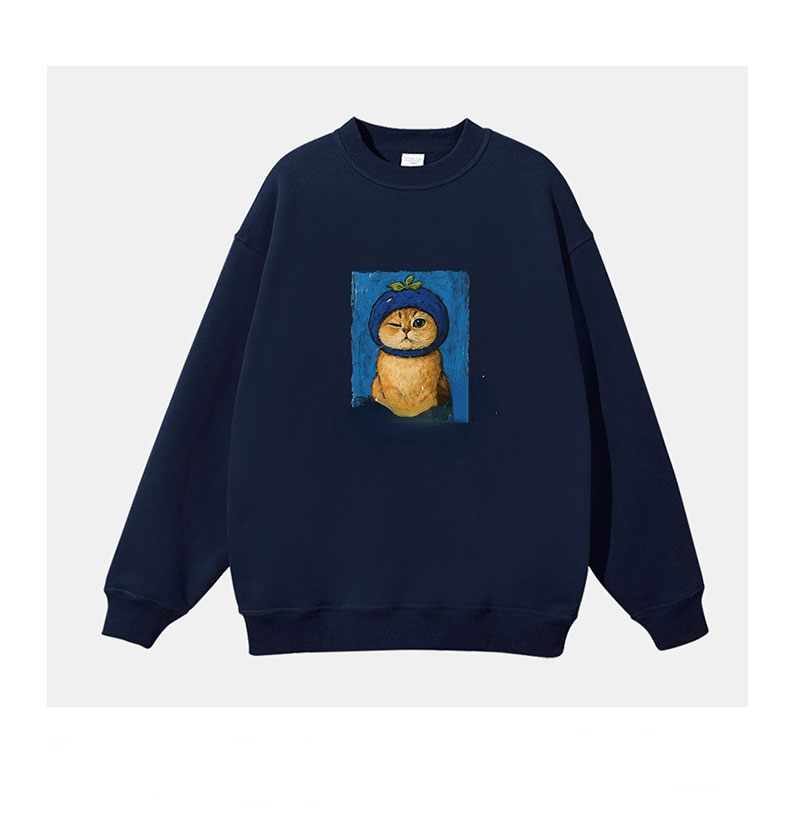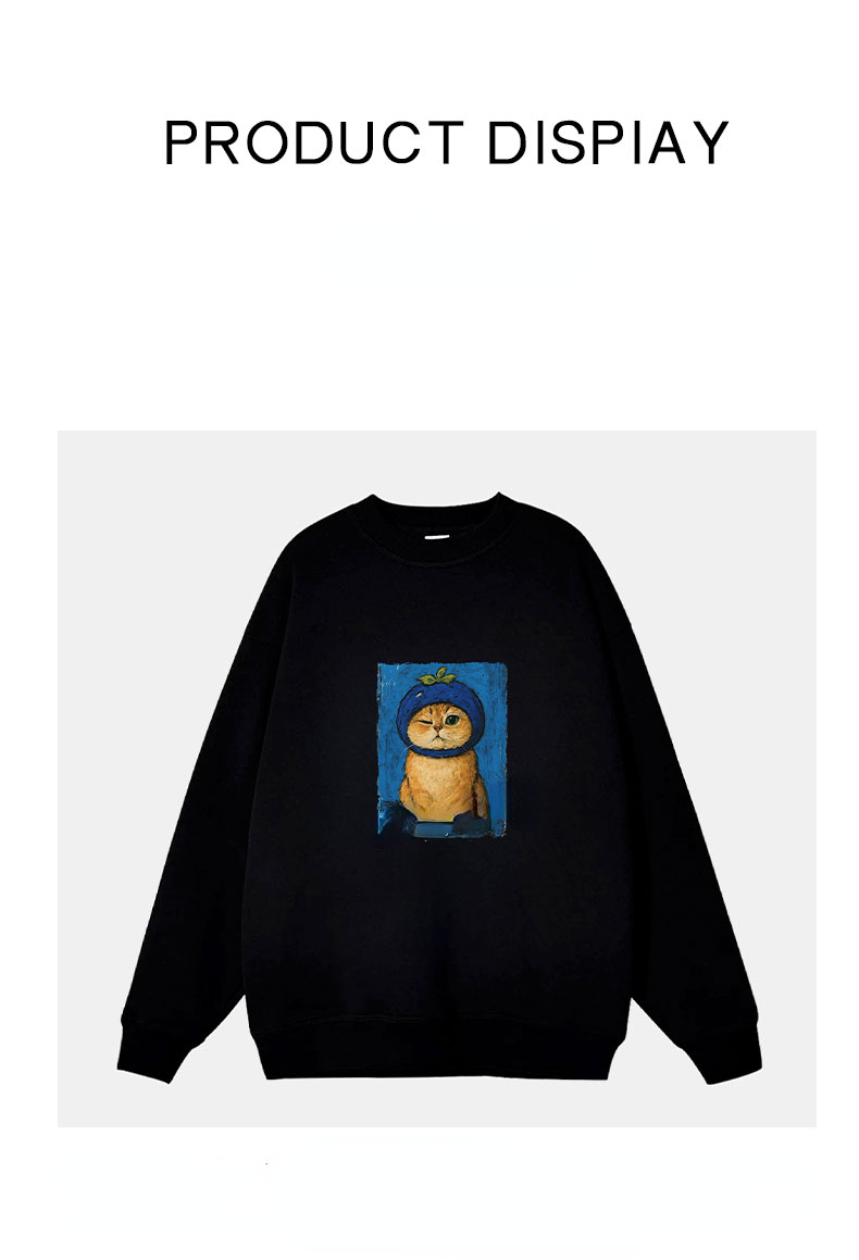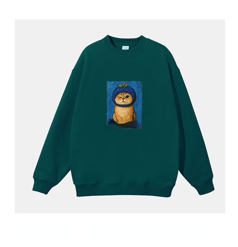 重磅純棉大學T,正面飾有可愛橘貓戴草莓印花,100%純棉柔軟親膚,厚實版型俐落有型,休閒百搭。