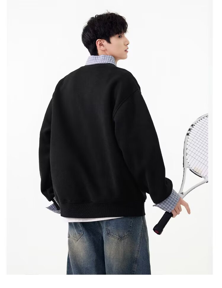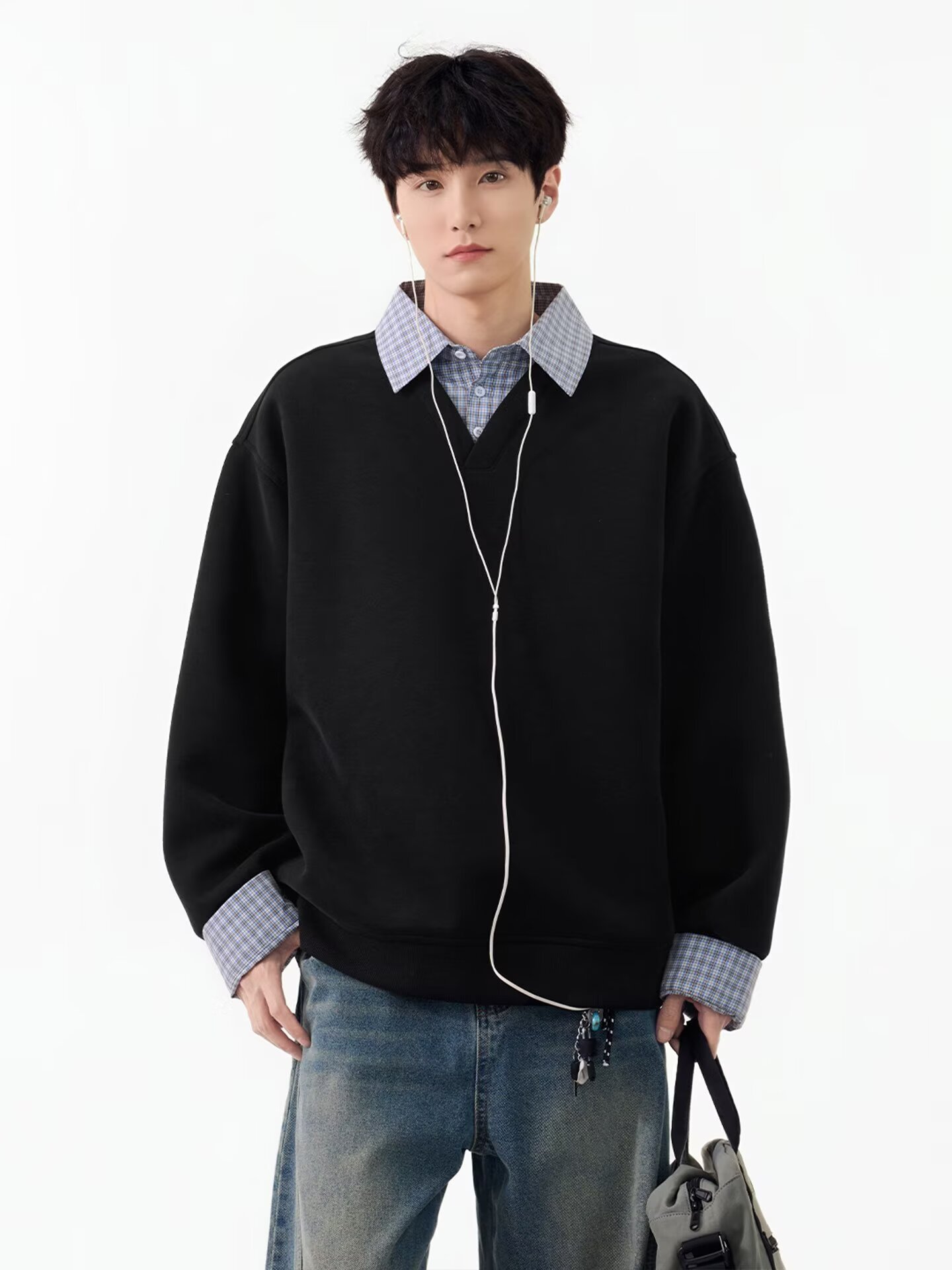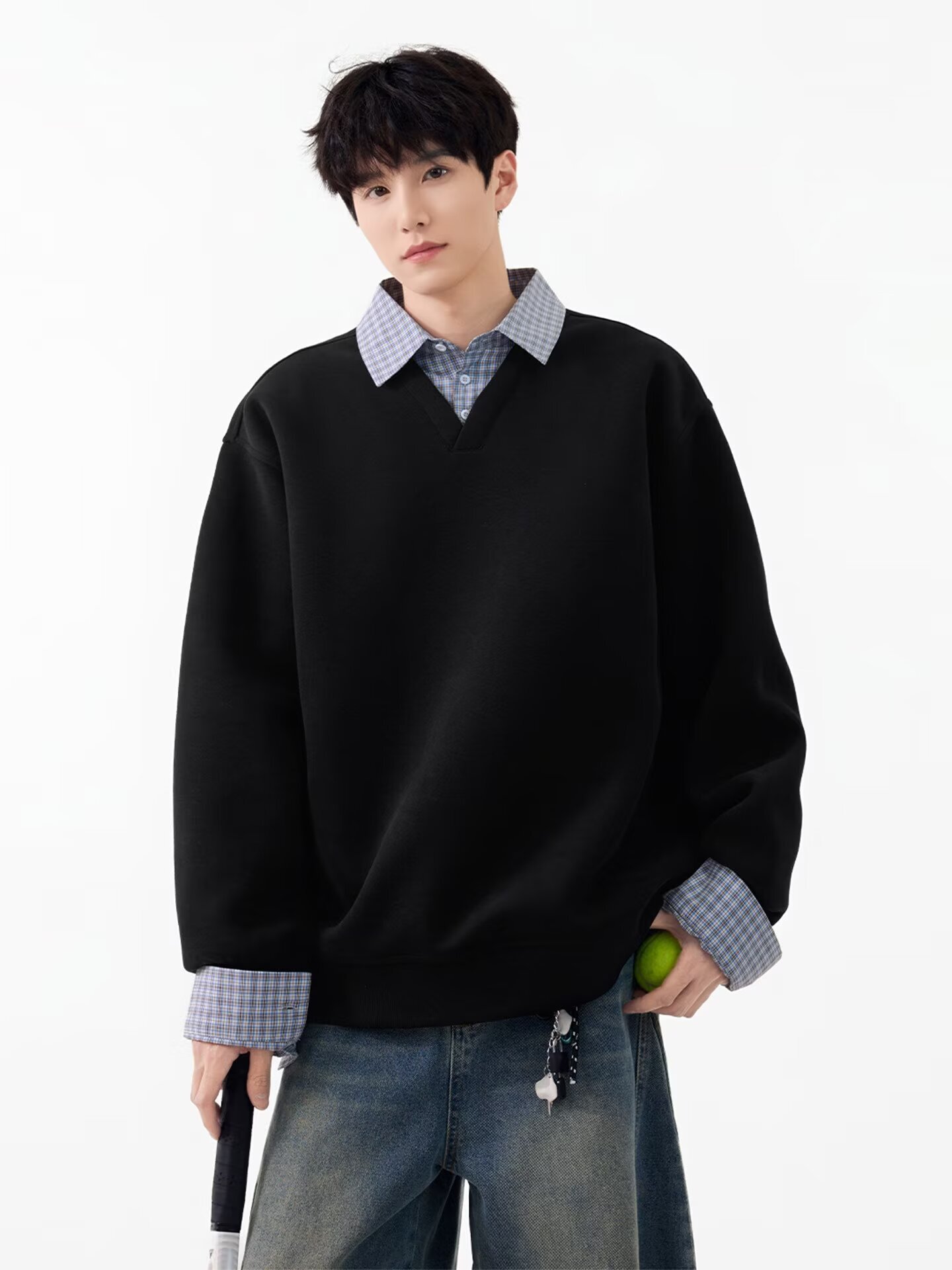 黑色假兩件格紋領大學 T,以格紋領與袖口細節營造出自然的疊穿層次感,採用寬鬆休閒版型,穿著舒適不挑身型。男女皆適用,日常通勤、休閒出街皆可輕鬆搭配衛褲、牛仔褲等下裝,打造隨性有型的休閒造型。