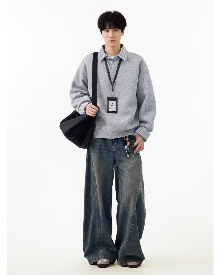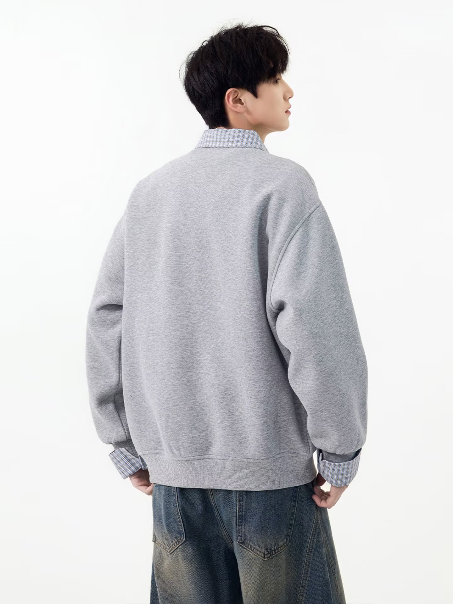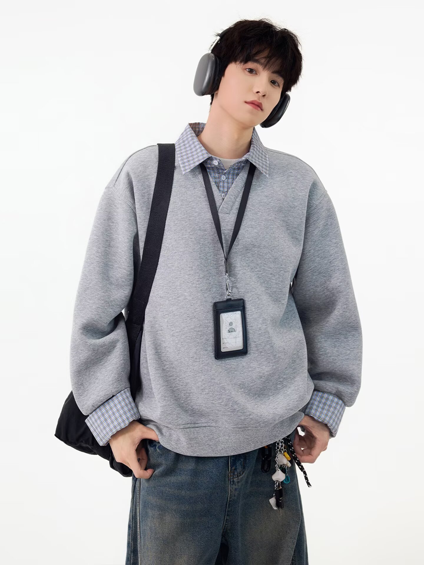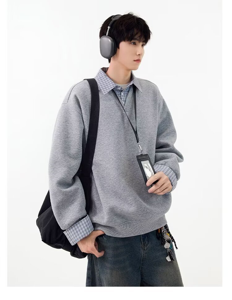 黑色假兩件格紋領大學 T,以格紋領與袖口細節營造出自然的疊穿層次感,採用寬鬆休閒版型,穿著舒適不挑身型。男女皆適用,日常通勤、休閒出街皆可輕鬆搭配衛褲、牛仔褲等下裝,打造隨性有型的休閒造型。