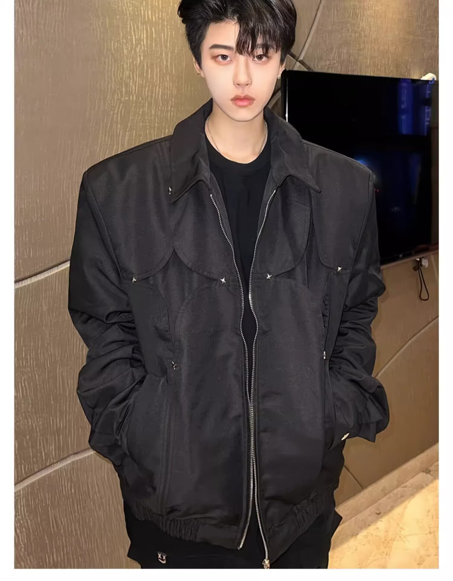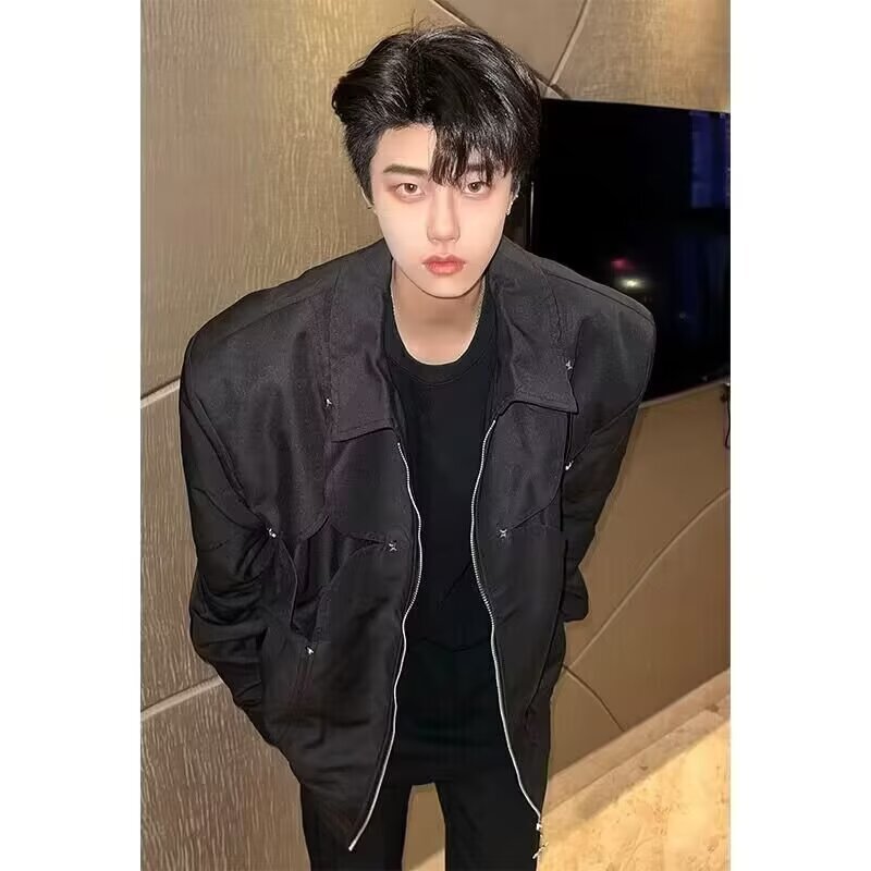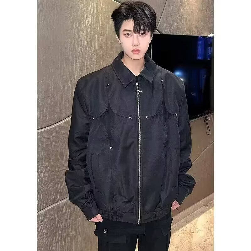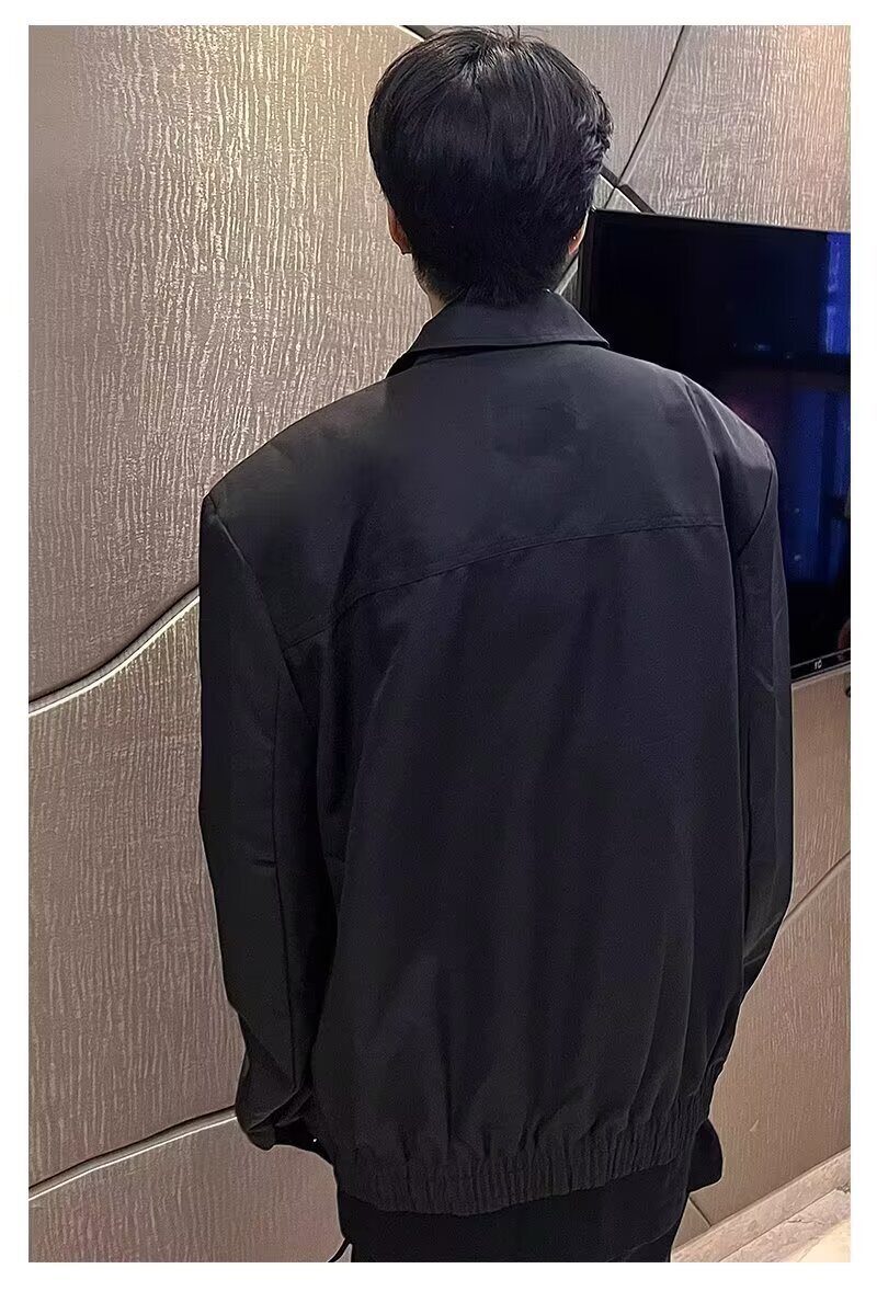 這是一款黑色麂皮質感翻領夾克,採用寬鬆墊肩版型,帶來高級暗黑氛圍與痞帥氣場。內搭純黑大學 T 即可打造利落全黑造型,日常通勤與休閒出街皆適用,男女皆可輕鬆駕馭,輕鬆打造個性穿搭。