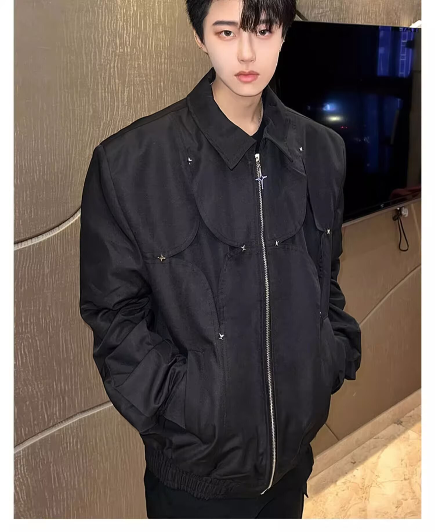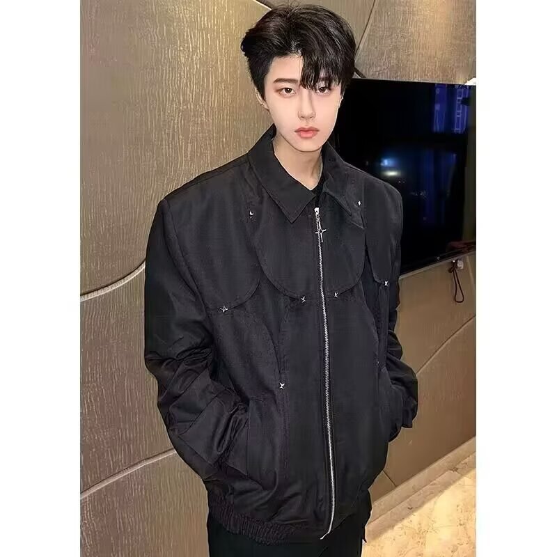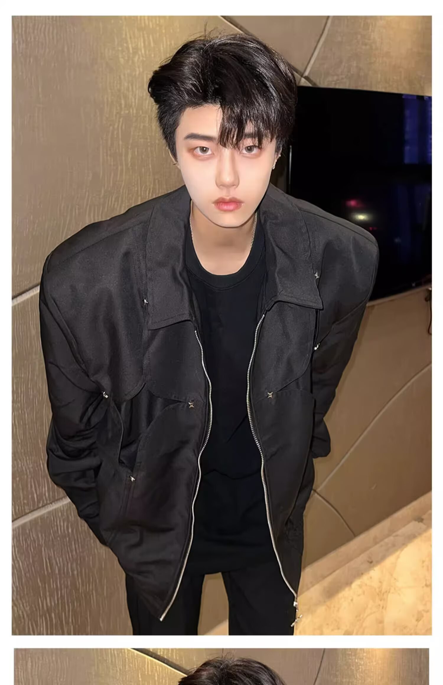 這是一款黑色麂皮質感翻領夾克,採用寬鬆墊肩版型,帶來高級暗黑氛圍與痞帥氣場。內搭純黑大學 T 即可打造利落全黑造型,日常通勤與休閒出街皆適用,男女皆可輕鬆駕馭,輕鬆打造個性穿搭。